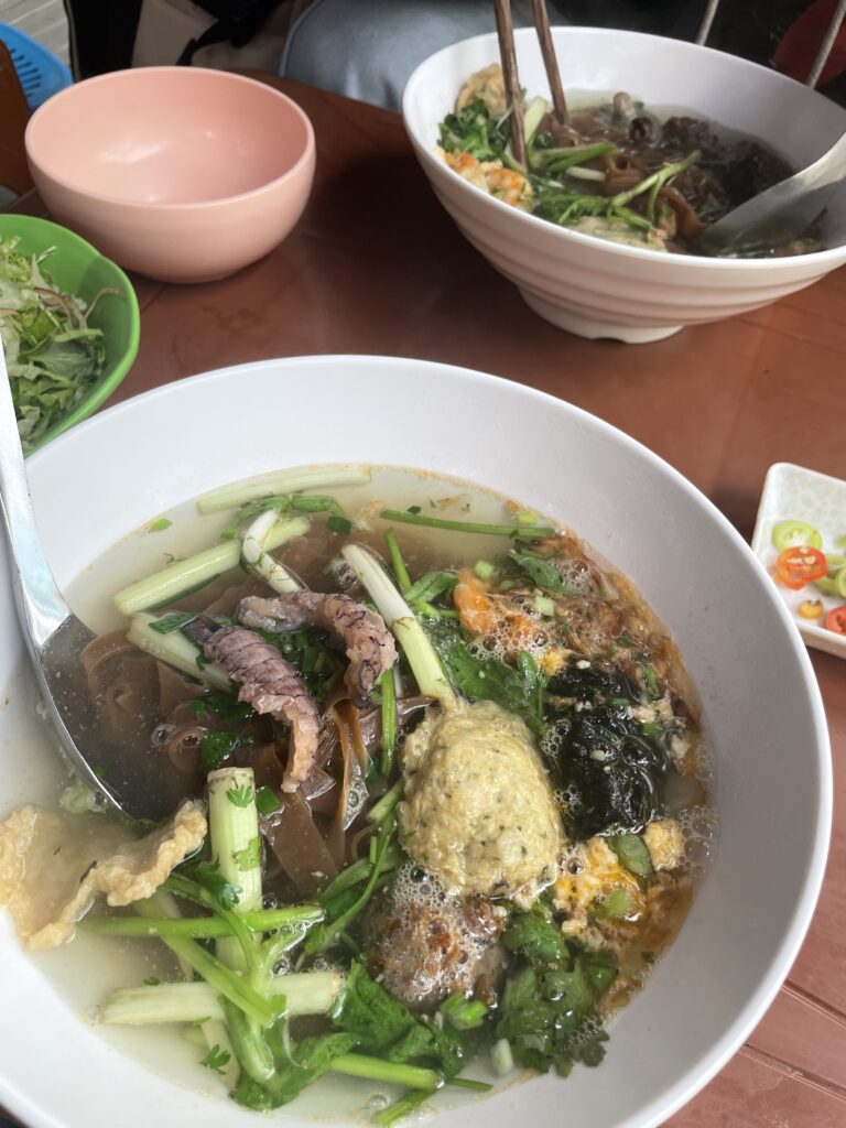 お、おいしすぎる!!蟹の身がたっぷり入って旨味がすごい!シャコまで入ってる!平 麺 も日本では食べたことのない味で少し甘みがある?フォーよりずいぶんと歯ごたえがありました。なんとこれで240円。円安でも優しいベトナム旅行です。
